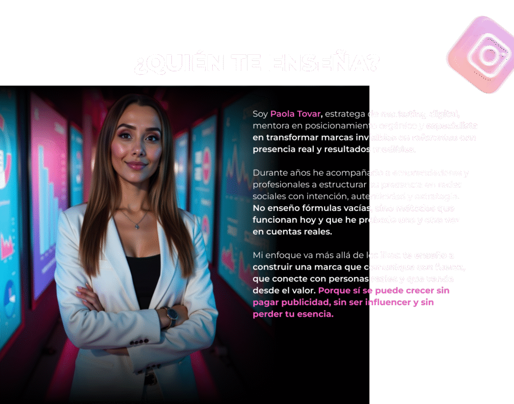 Soy Paola Tovar, estratega de marketing digital, mentora en posicionamiento orgánico y especialista en transformar marcas invisibles en referentes con presencia real y resultados medibles.